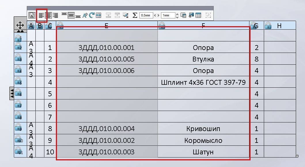 Далее отредактируем полученную таблицу спецификации. Для этого выделяем поочередно столбцы с Обозначением и наименованиям деталей и ставим им ориентацию по левому краю.