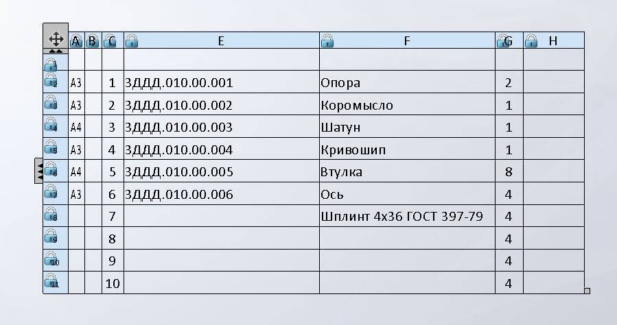 После чего нам надо разнести стандартные изделия и детали на спецификации. Для этого в таблицу спецификации нужно вставить пустые строки после детали «Ось».
