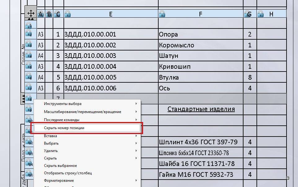 Теперь нужно расположить детали в спецификации более правильно, то есть детали расположить выше, а стандартные изделия под следующими номерами.