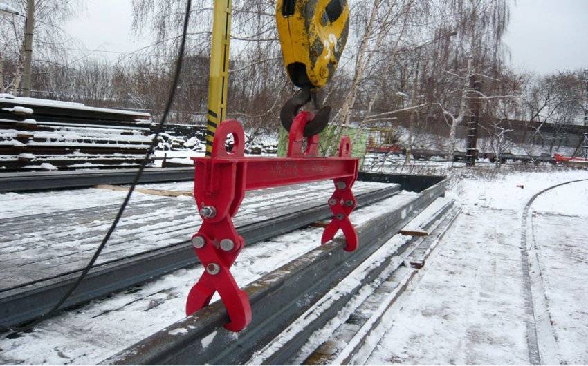 Для перемещения рельсов в горизонтальном положении может использоваться траверса, снабженная по сторонам парой захватов любого типа, чаще всего – вилочного.