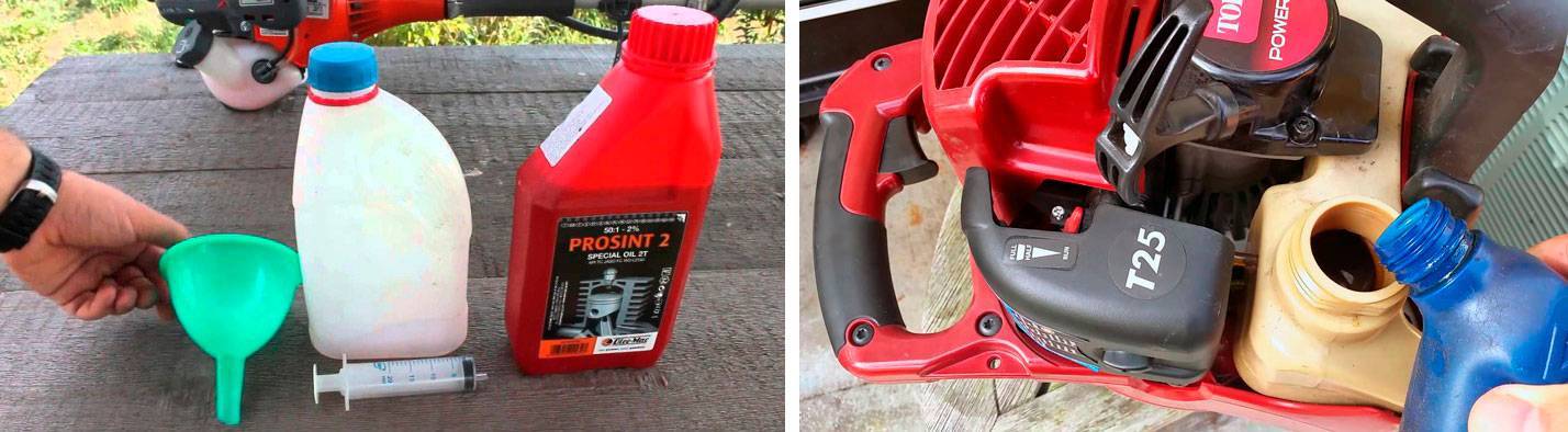 Очень удобная вещь – специальная бутылка с дозатором от бренда Stihl (на фото), позволяющая выполнять все действия аккуратно и быстро, точно отмеряя нужное количество каждого вещества