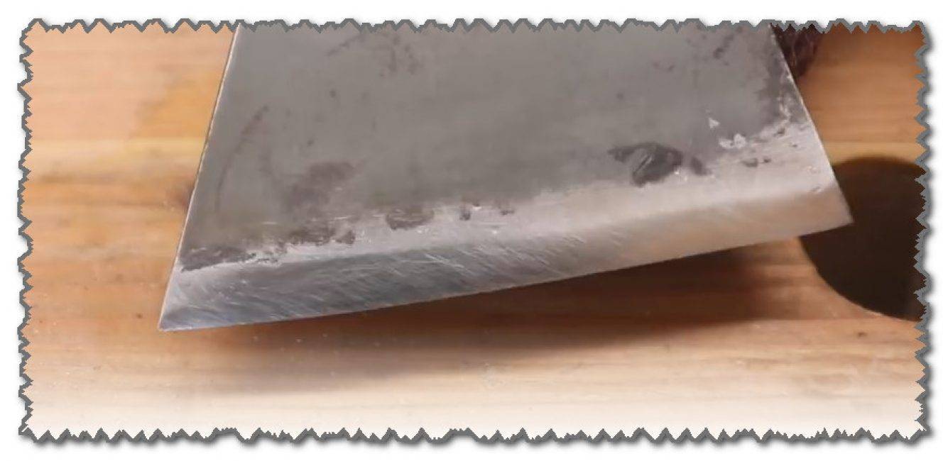 Если осмотреть лезвие топора на свет, то можно увидеть незначительные дефекты. Топор уже очень острый, однако на режущей кромке всё ещё есть мелкие зазубрины, которые будут рвать дерево при его тёсе.